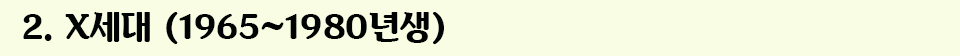 기술 변화: 이 세대는 아날로그 시대에서 디지털 시대로의 전환을 경험했습니다. 컴퓨터와 인터넷의 발전이 시작된 시기에 성장하여, 새로운 기술에 대한 적응력이 비교적 높습니다. 하지만 베이비부머 세대에 비해 디지털 환경에 더 익숙한 세대입니다.